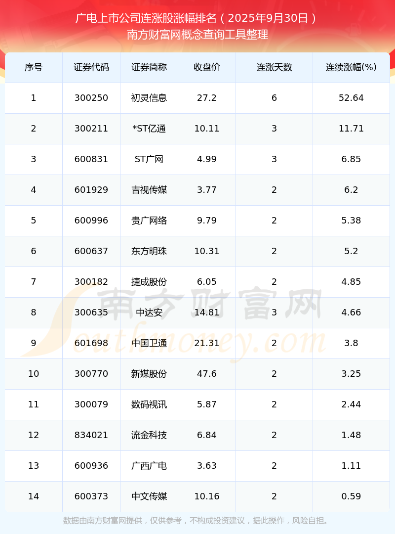 根據南方財富網概念查詢工具數據統(tǒng)計,截止2025年9月30日收盤,廣電上市公司共有14只個股實現連漲。其中連續(xù)漲幅較大的個股有初靈信息、*ST億通、ST廣網等,連續(xù)漲幅分別為52.64%、11.71%、6.85%。