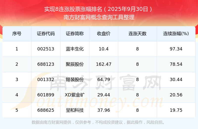 2025年9月30日實(shí)現(xiàn)8連漲股票漲幅排名