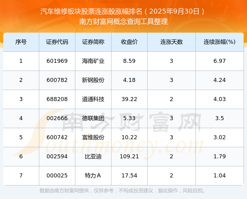 根據南方財富網概念查詢工具數據統(tǒng)計,截止2025年9月30日收盤,汽車維修板塊股票共有7只個股實現連漲。其中連續(xù)漲幅較大的個股有海南礦業(yè)、新鋼股份、道通科技等,連續(xù)漲幅分別為6.97%、4.24%、4.03%。