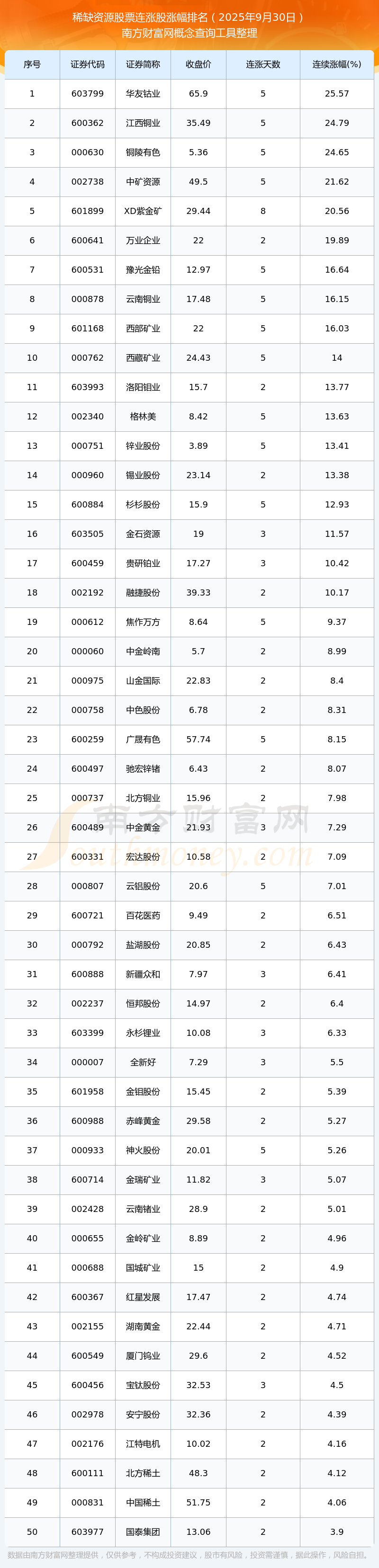 2025年9月30日稀缺資源股票連漲股漲幅排名