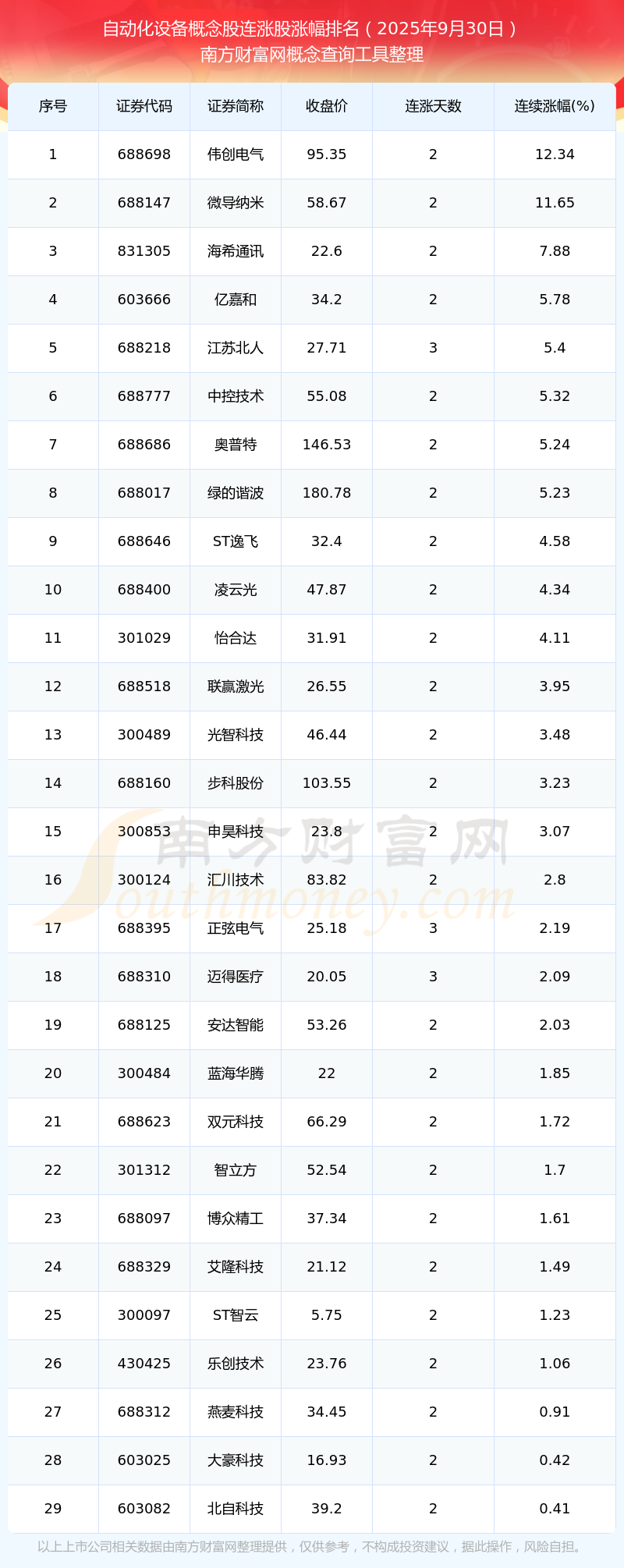2025年9月30日自動(dòng)化設(shè)備概念股連漲股漲幅排名