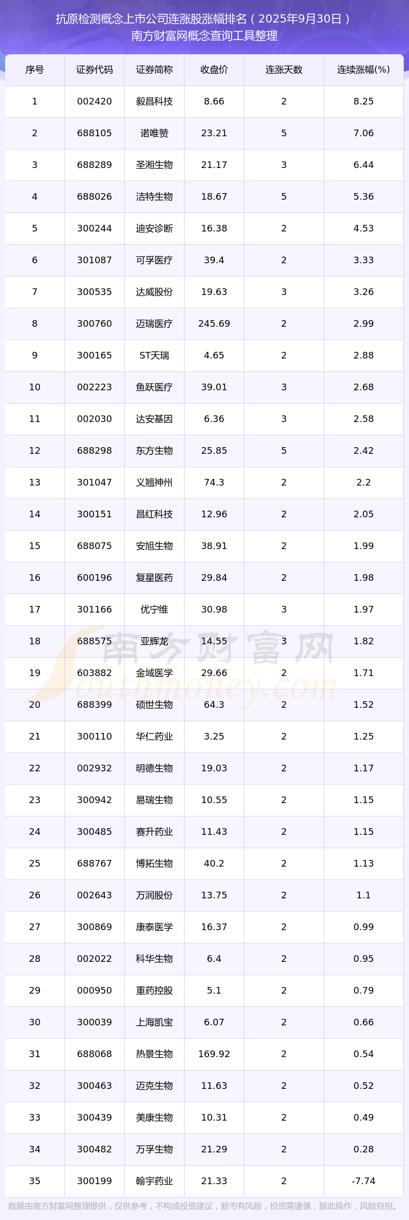 2025年9月30日抗原檢測(cè)概念上市公司連漲股漲幅排名