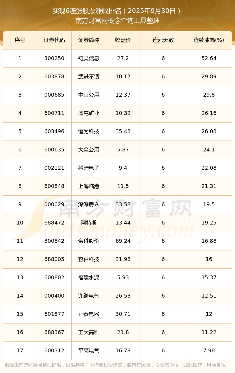 2025年9月30日實現(xiàn)6連漲股票漲幅排名