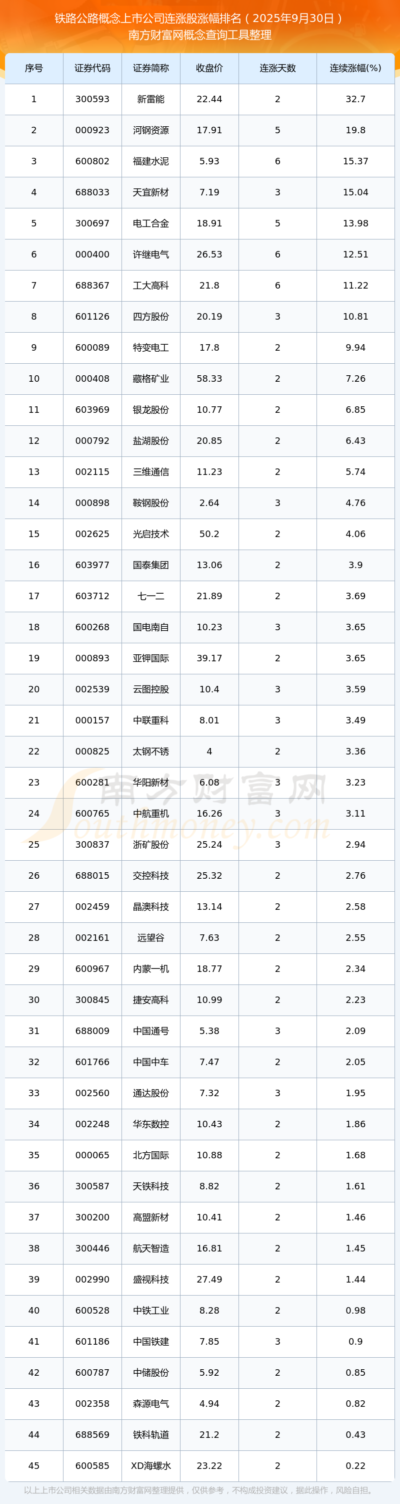 根據南方財富網概念查詢工具數據統(tǒng)計,截止2025年9月30日收盤,鐵路公路概念上市公司共有45只個股實現連漲。其中連續(xù)漲幅較大的個股有新雷能、河鋼資源、福建水泥等,連續(xù)漲幅分別為32.70%、19.80%、15.37%。