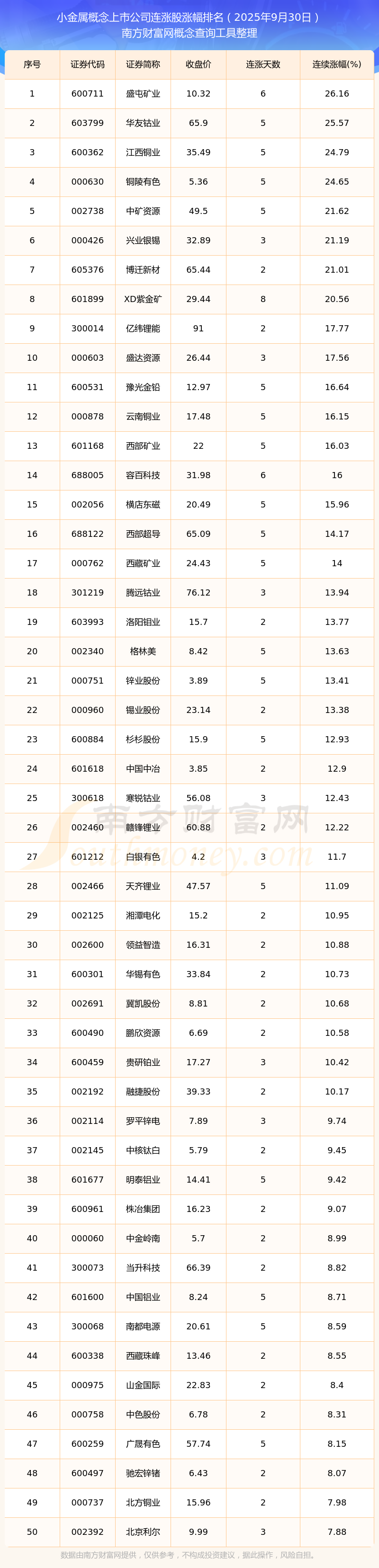 2025年9月30日小金屬概念上市公司連漲股漲幅排名