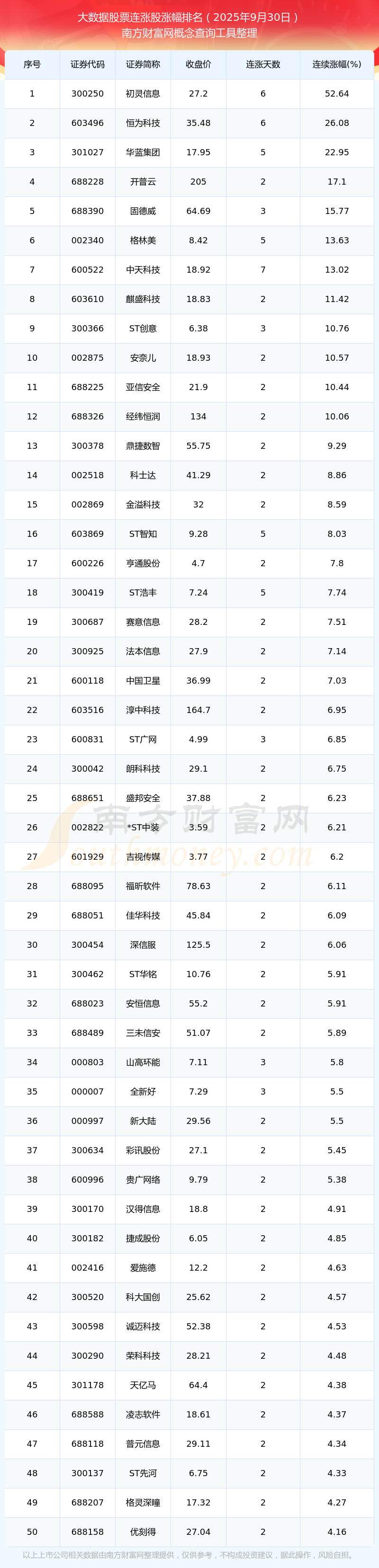 2025年9月30日大數(shù)據(jù)股票連漲股漲幅排名