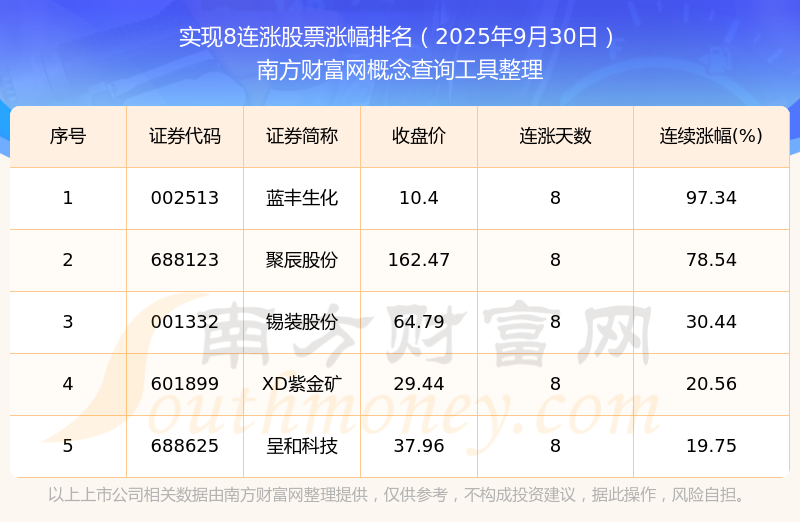 2025年9月30日實現(xiàn)8連漲股票漲幅排名