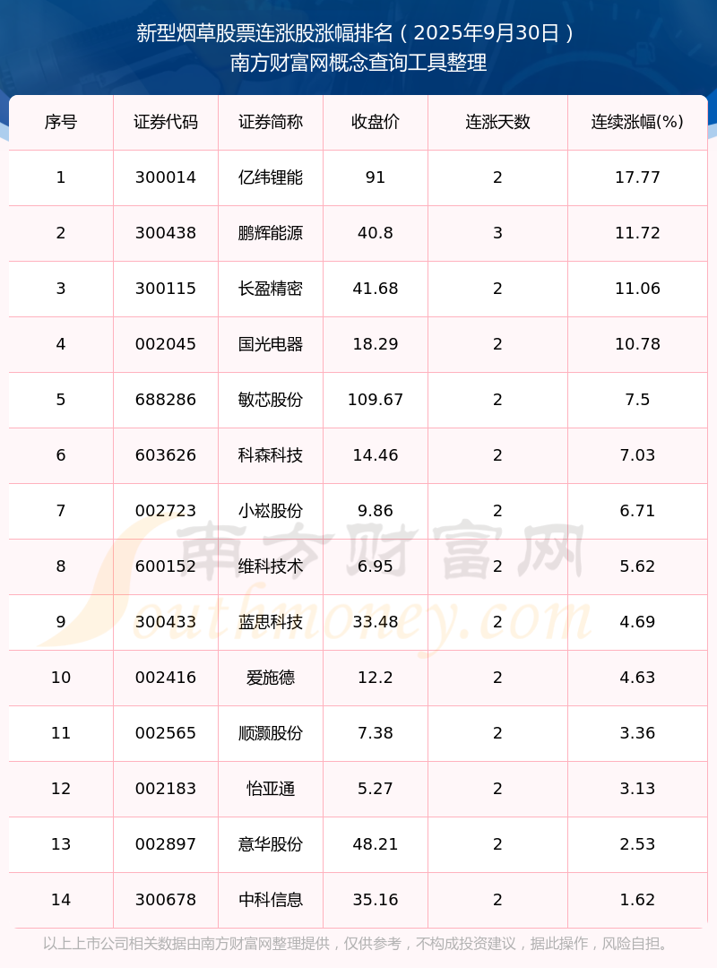 2025年9月30日新型煙草股票連漲股漲幅排名