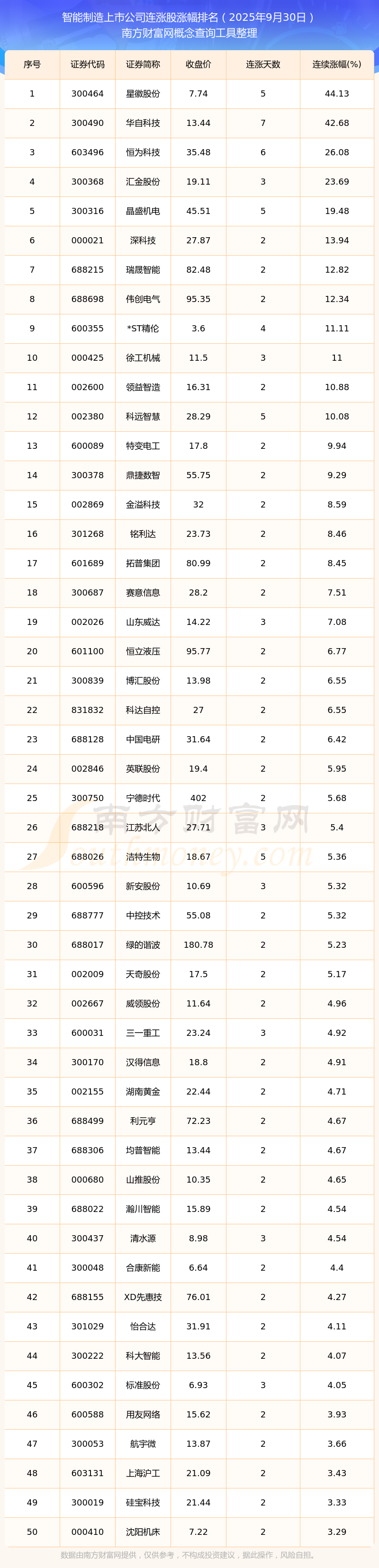 2025年9月30日智能制造上市公司連漲股漲幅排名