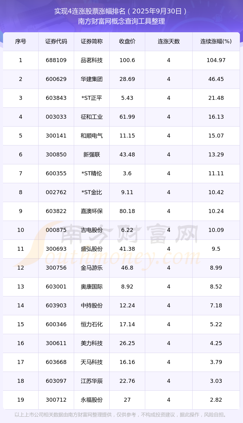 【今日股市】2025年9月30日19只股票實(shí)現(xiàn)4連漲!