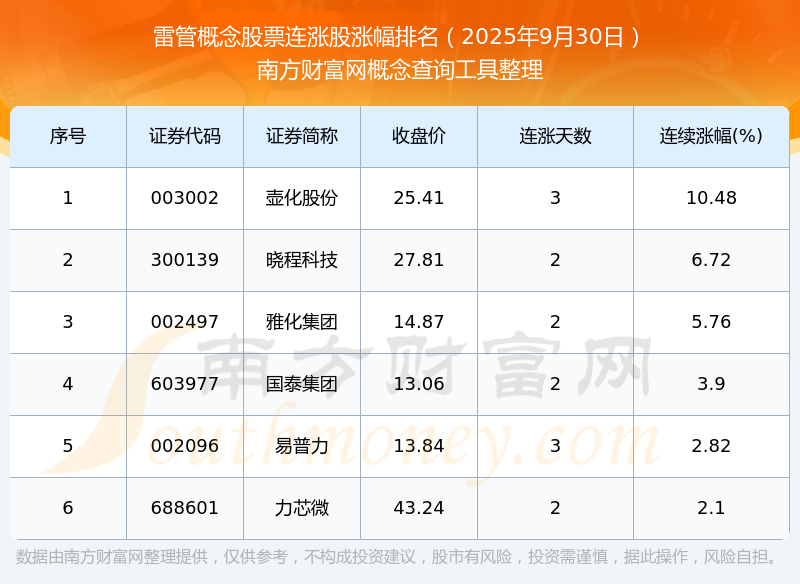 2025年9月30日雷管概念股票連漲股漲幅排名