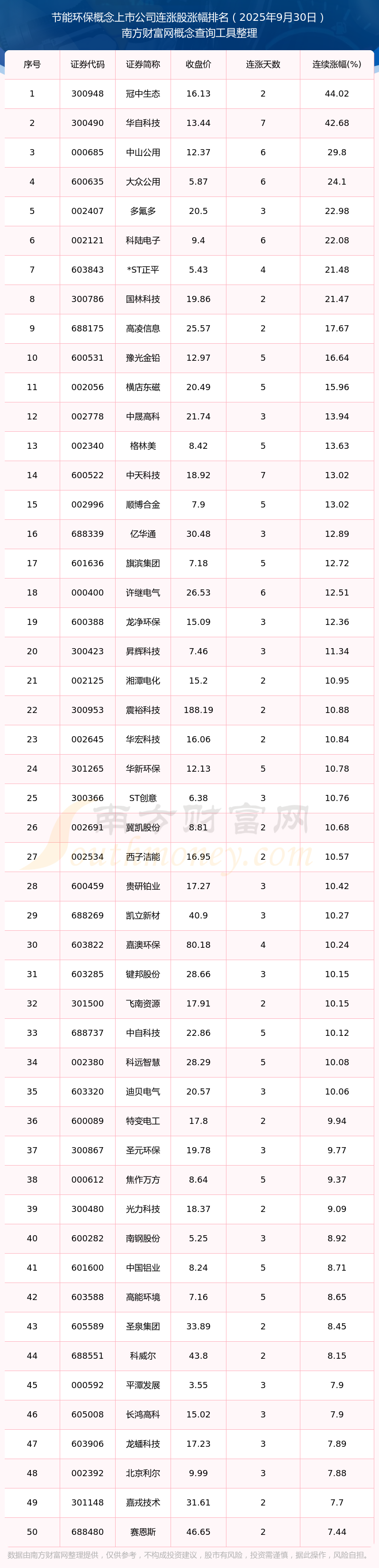 2025年9月30日節(jié)能環(huán)保概念上市公司連漲股漲幅排名