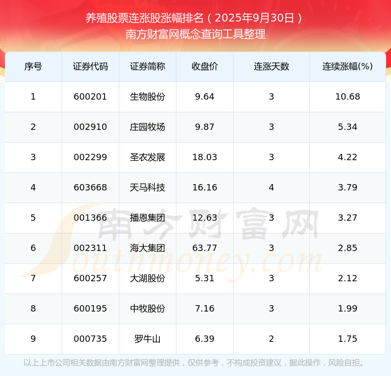 2025年9月30日養(yǎng)殖股票連漲股漲幅排名
