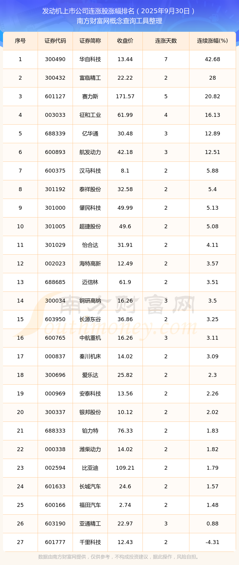 2025年9月30日發(fā)動機(jī)上市公司連漲股漲幅排名
