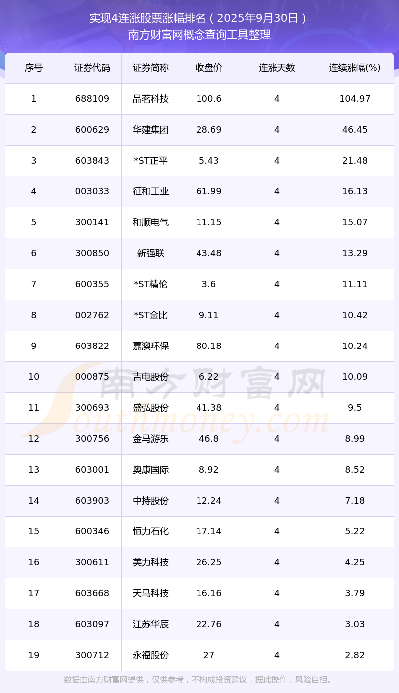 2025年9月30日實(shí)現(xiàn)4連漲股票漲幅排名