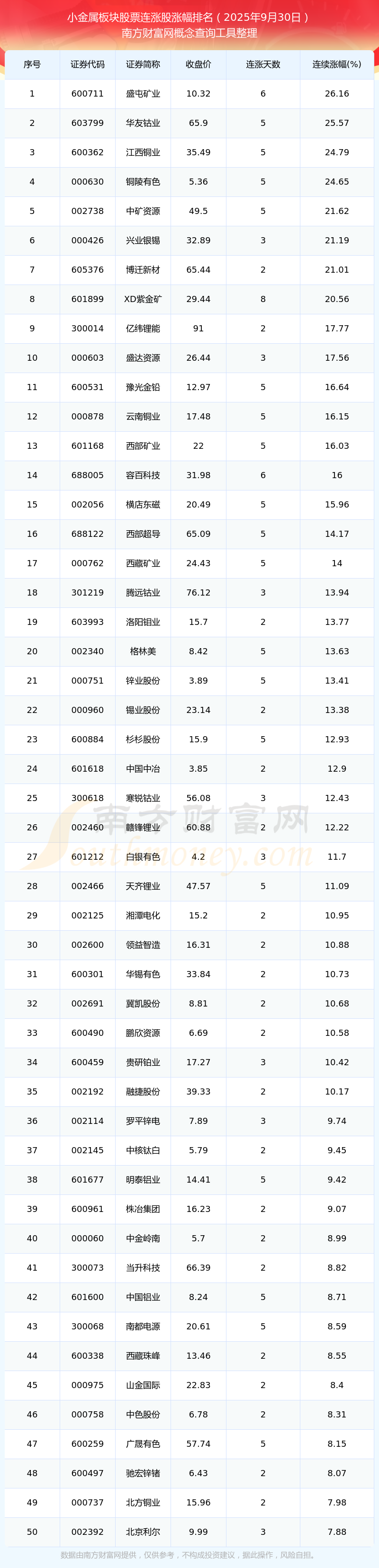2025年9月30日小金屬板塊股票連漲股漲幅排名