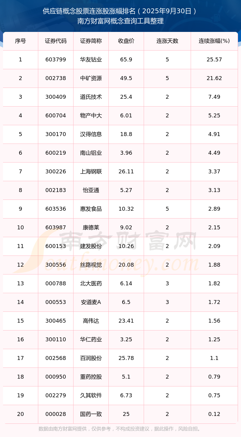 2025年9月30日供應(yīng)鏈概念股票連漲股漲幅排名