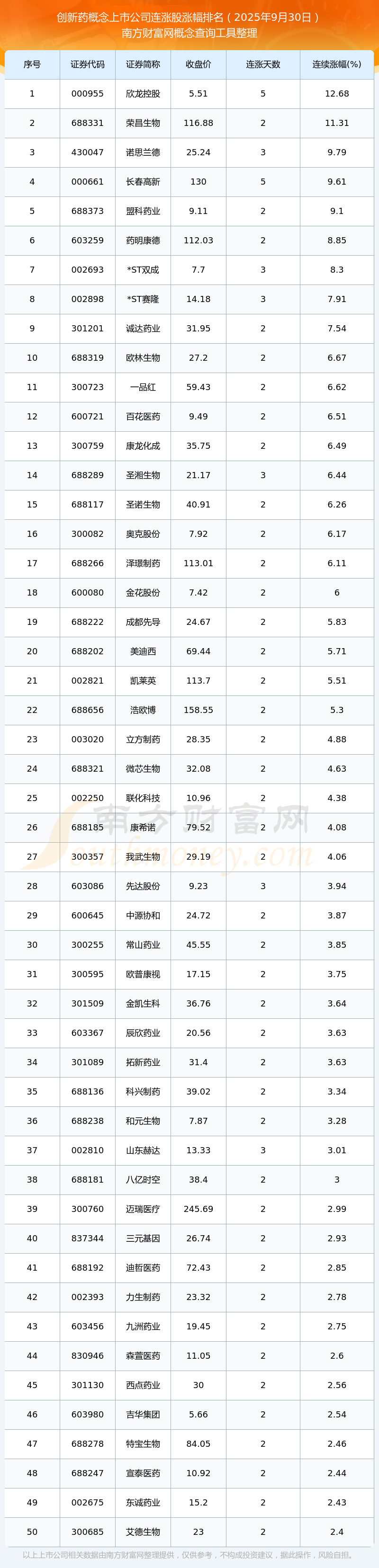2025年9月30日創(chuàng)新藥概念上市公司連漲股漲幅排名