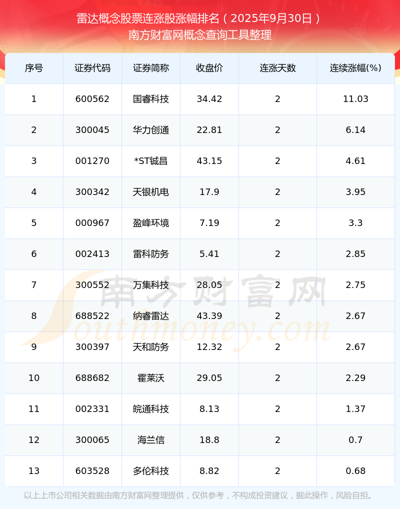 2025年9月30日雷達概念股票連漲股漲幅排名