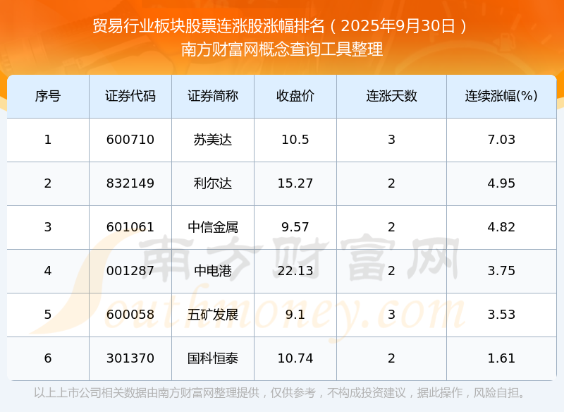 2025年9月30日貿(mào)易行業(yè)板塊股票連漲股漲幅排名