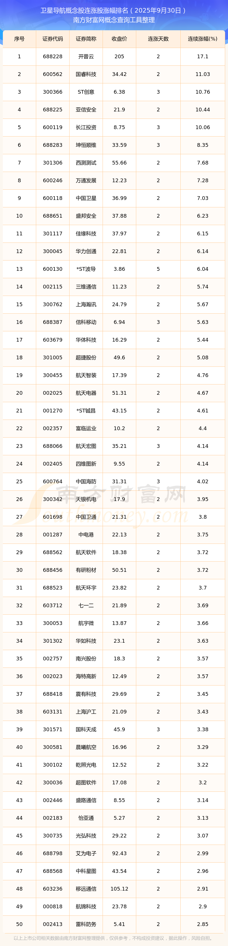 2025年9月30日衛(wèi)星導(dǎo)航概念股連漲股漲幅排名