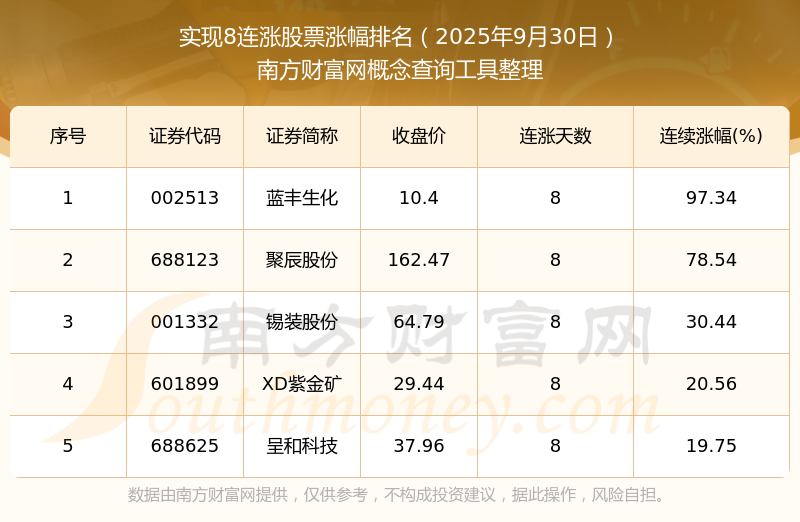 2025年9月30日實現(xiàn)8連漲股票漲幅排名