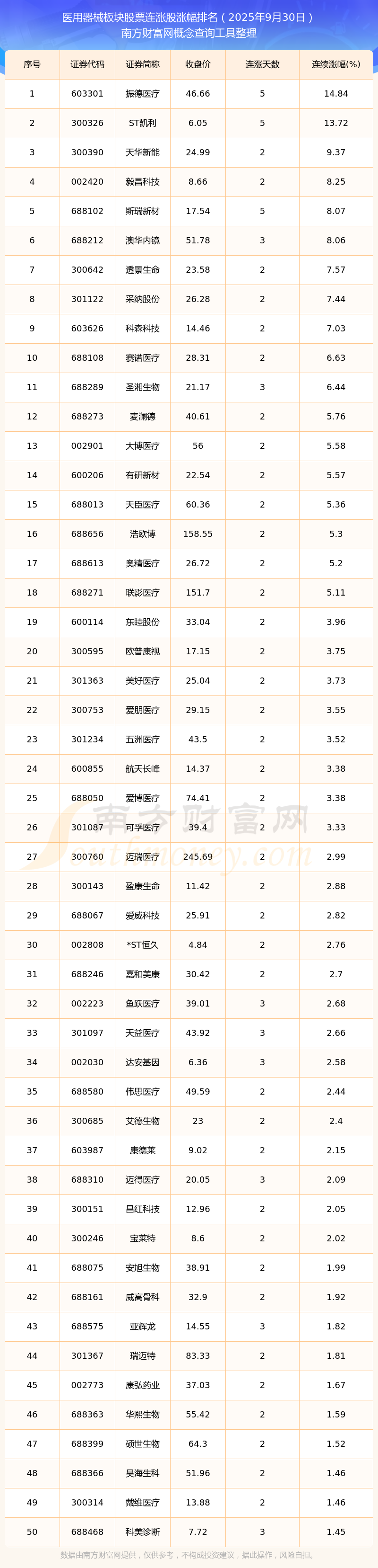 2025年9月30日醫(yī)用器械板塊股票連漲股漲幅排名