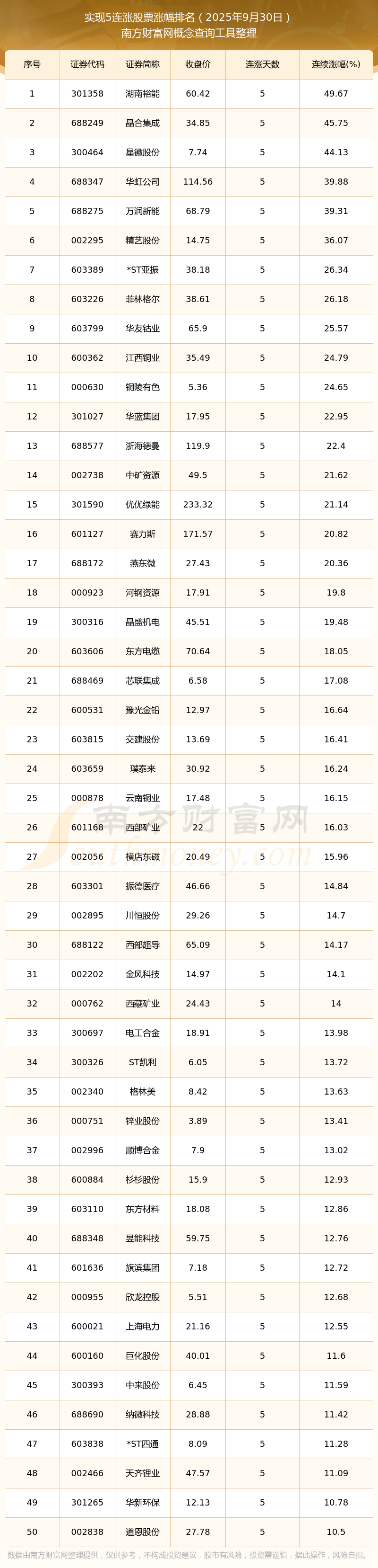 2025年9月30日實(shí)現(xiàn)5連漲股票漲幅排名