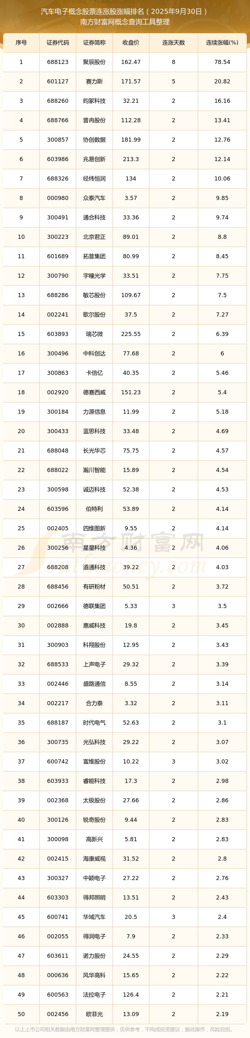 根據(jù)南方財富網(wǎng)概念查詢工具數(shù)據(jù)統(tǒng)計,截止2025年9月30日收盤,汽車電子概念股票共有69只個股實現(xiàn)連漲。其中連續(xù)漲幅較大的個股有聚辰股份、賽力斯、昀冢科技等,連續(xù)漲幅分別為78.54%、20.82%、16.16%。