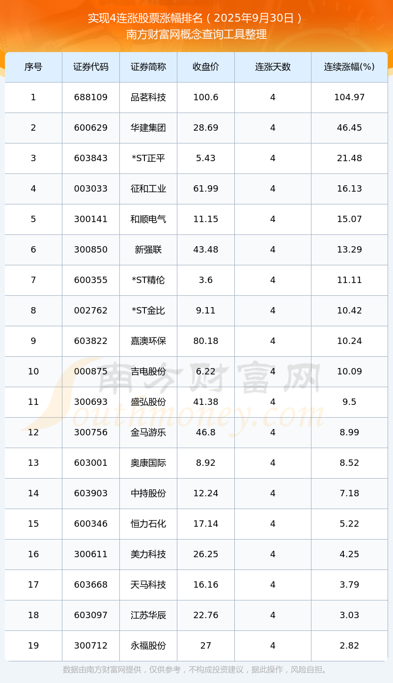 根據南方財富網概念查詢工具數據統(tǒng)計,截止2025年9月30日收盤,共有19只個股實現4天連漲。其中連續(xù)漲幅較大的個股有品茗科技、華建集團、*ST正平等,連續(xù)漲幅分別為104.97%、46.45%、21.48%。