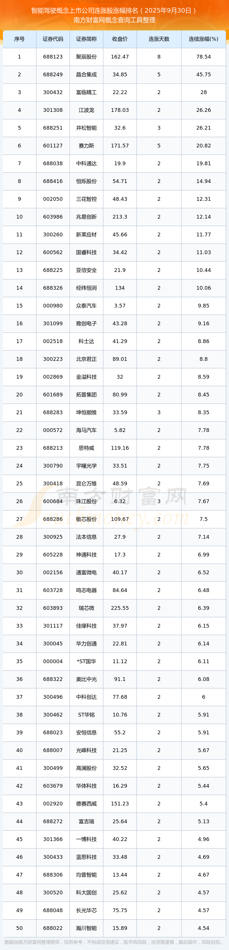 2025年9月30日智能駕駛概念上市公司連漲股漲幅排名