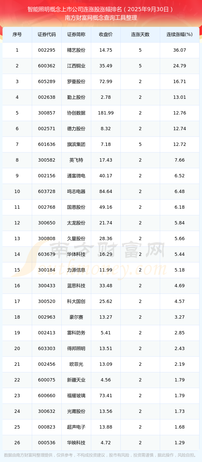 根據(jù)南方財(cái)富網(wǎng)概念查詢工具數(shù)據(jù)統(tǒng)計(jì),截止2025年9月30日收盤,智能照明概念上市公司共有26只個(gè)股實(shí)現(xiàn)連漲。其中連續(xù)漲幅較大的個(gè)股有精藝股份、江西銅業(yè)、羅曼股份等,連續(xù)漲幅分別為36.07%、24.79%、16.71%。