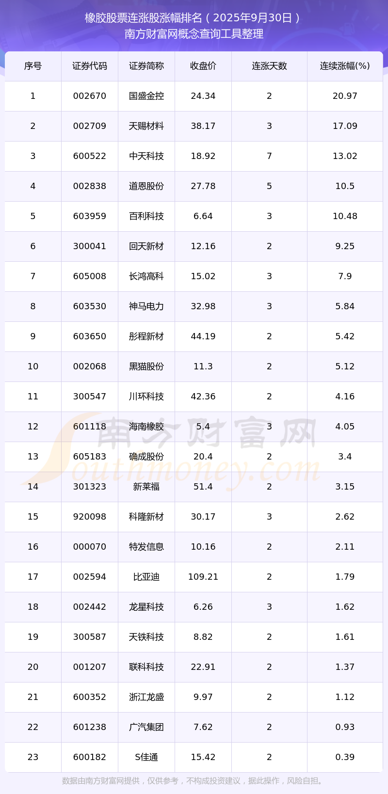 根據(jù)南方財富網(wǎng)概念查詢工具數(shù)據(jù)統(tǒng)計,截止2025年9月30日收盤,橡膠股票共有23只個股實現(xiàn)連漲。其中連續(xù)漲幅較大的個股有國盛金控、天賜材料、中天科技等,連續(xù)漲幅分別為20.97%、17.09%、13.02%。