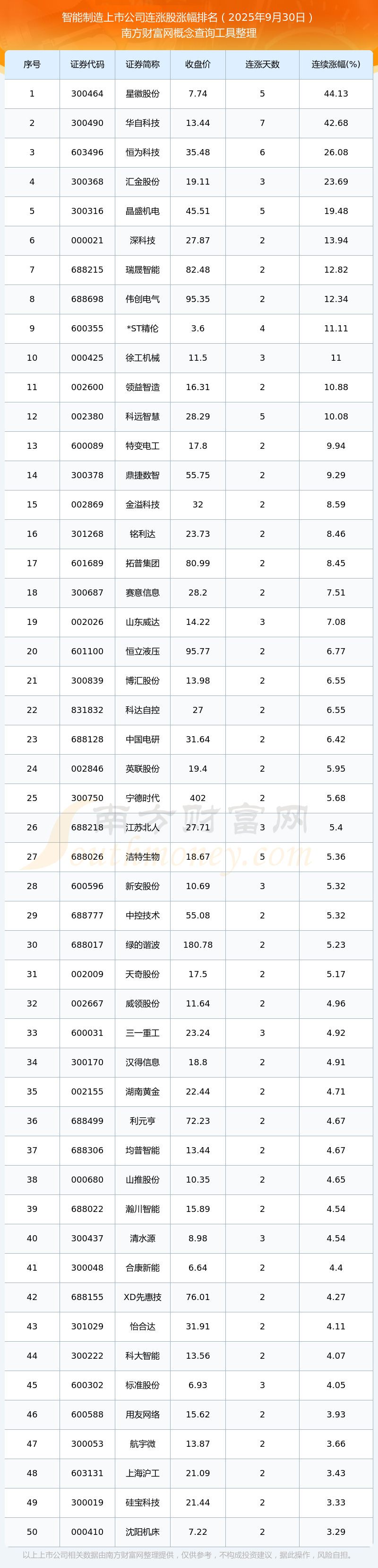2025年9月30日智能制造上市公司連漲股漲幅排名