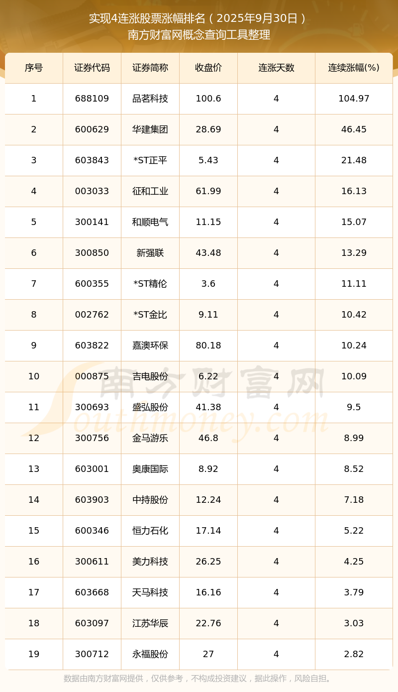 2025年9月30日實(shí)現(xiàn)4連漲股票漲幅排名