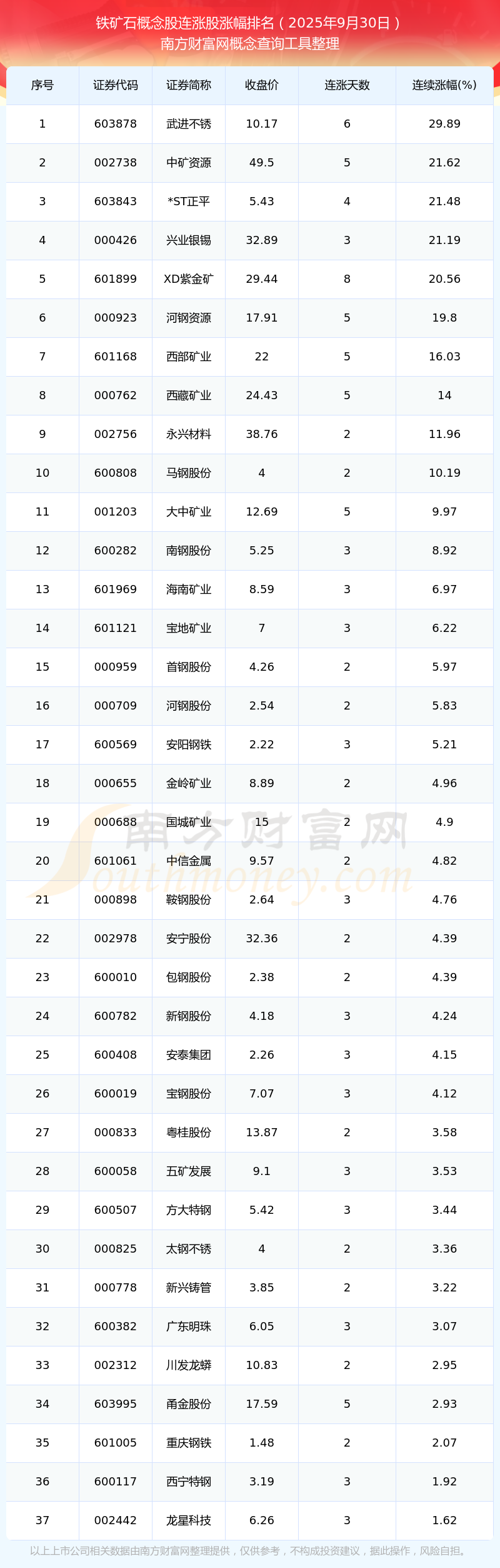 2025年9月30日鐵礦石概念股連漲股漲幅排名