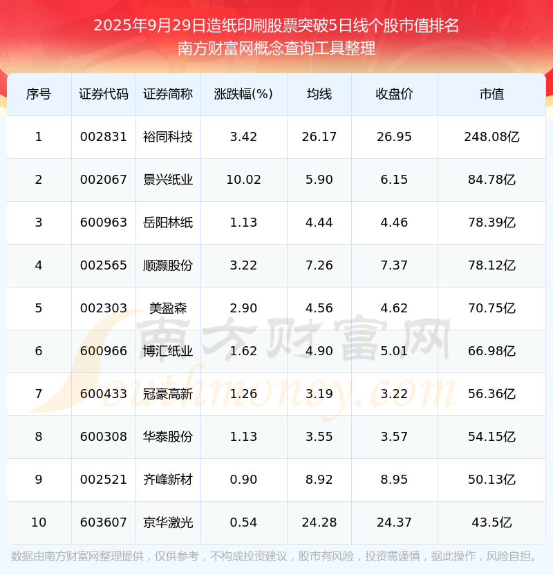 2025年9月29日造紙印刷股票突破5日線個(gè)股市值排名