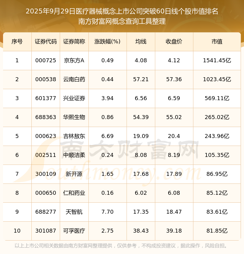 2025年9月29日醫(yī)療器械概念上市公司突破60日線個(gè)股市值排名