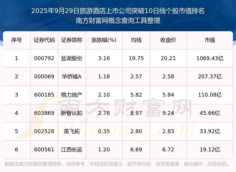 2025年9月29日旅游酒店上市公司突破10日線個股市值排名