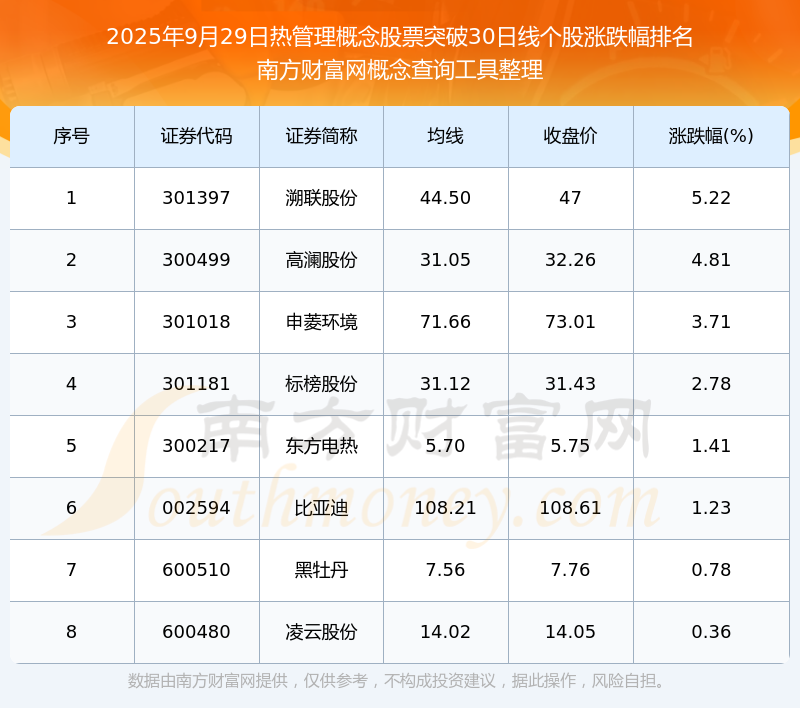 2025年9月29日熱管理概念股票突破30日線個(gè)股漲跌幅排名
