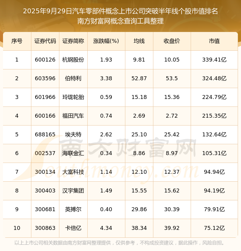 2025年9月29日汽車零部件概念上市公司突破半年線個股市值排名