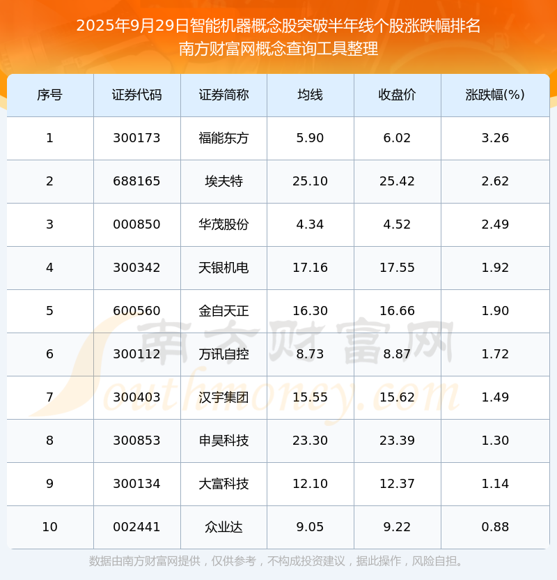 根據(jù)南方財(cái)富網(wǎng)概念查詢工具數(shù)據(jù)統(tǒng)計(jì),截止2025年9月29日收盤,智能機(jī)器概念股共有16只個(gè)股收盤價(jià)向上突破了半年線。其中漲幅較大的個(gè)股有福能東方、埃夫特、華茂股份等,漲幅分別為3.26%、2.62%、2.49%。