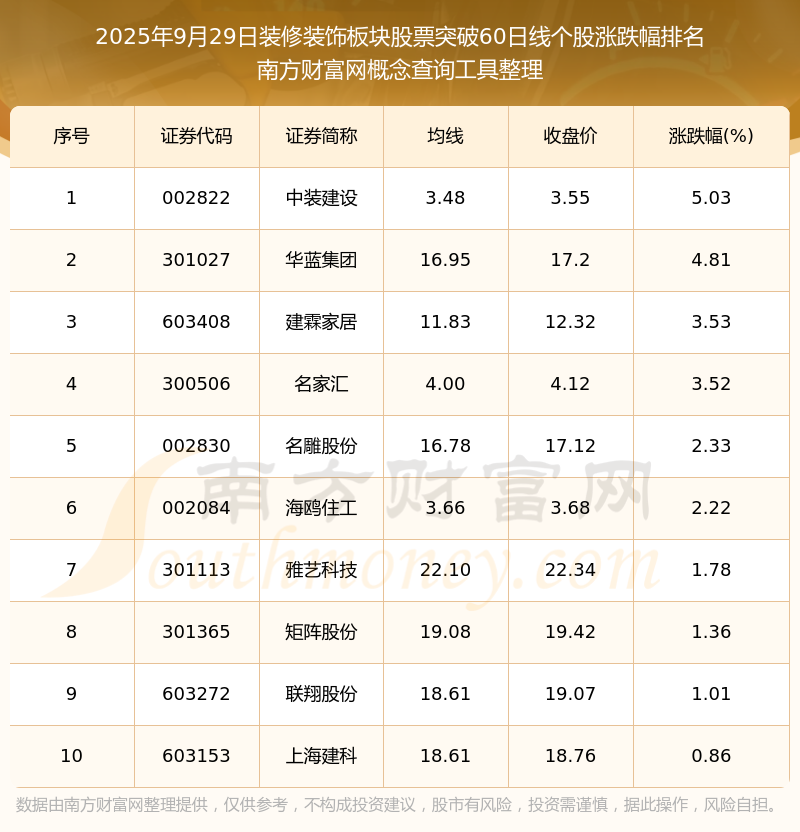 根據(jù)南方財富網(wǎng)概念查詢工具數(shù)據(jù)統(tǒng)計,截止2025年9月29日收盤,裝修裝飾板塊股票共有10只個股收盤價向上突破了60日線。其中漲幅較大的個股有中裝建設(shè)、華藍集團、建霖家居等,漲幅分別為5.03%、4.81%、3.53%。
