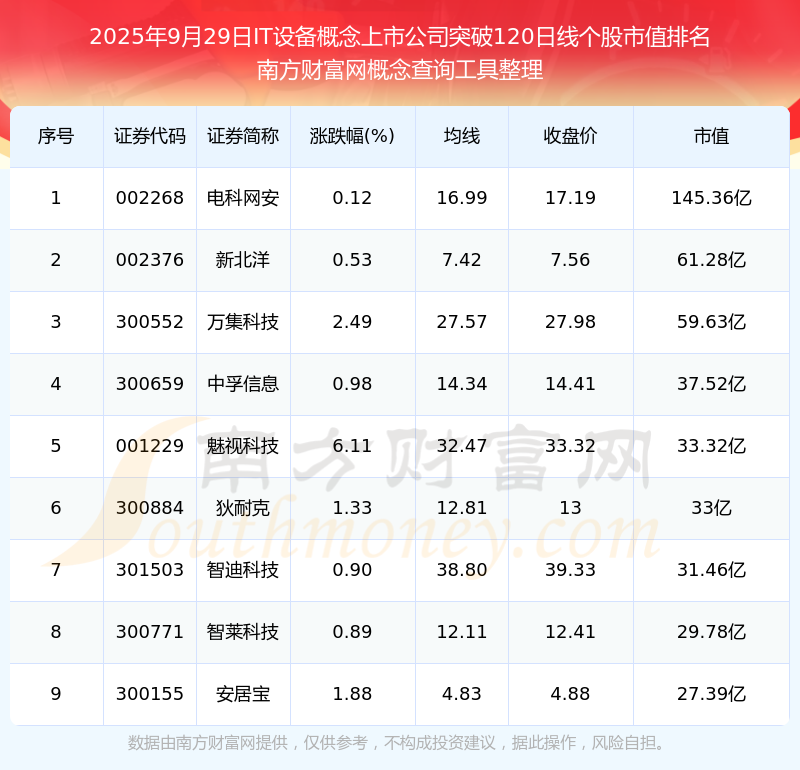 2025年9月29日IT設(shè)備概念上市公司突破120日線個(gè)股市值排名