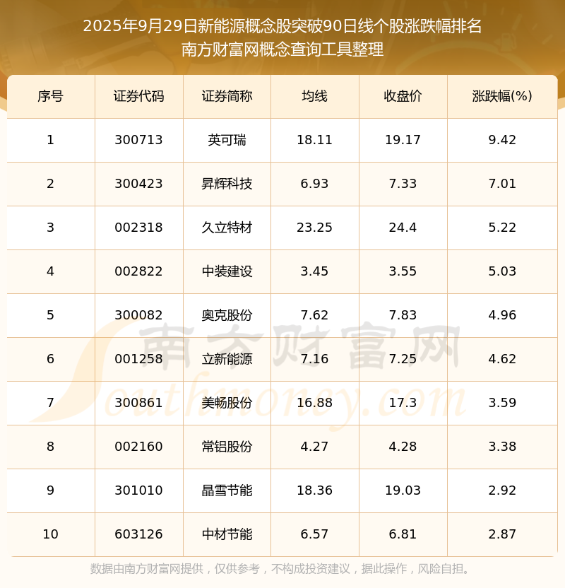 根據(jù)南方財富網(wǎng)概念查詢工具數(shù)據(jù)統(tǒng)計,截止2025年9月29日收盤,新能源概念股共有58只個股收盤價向上突破了90日線。其中漲幅較大的個股有英可瑞、昇輝科技、久立特材等,漲幅分別為9.42%、7.01%、5.22%。
