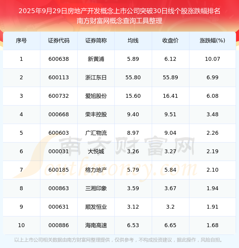 2025年9月29日房地產(chǎn)開(kāi)發(fā)概念上市公司突破30日線個(gè)股漲跌幅排名