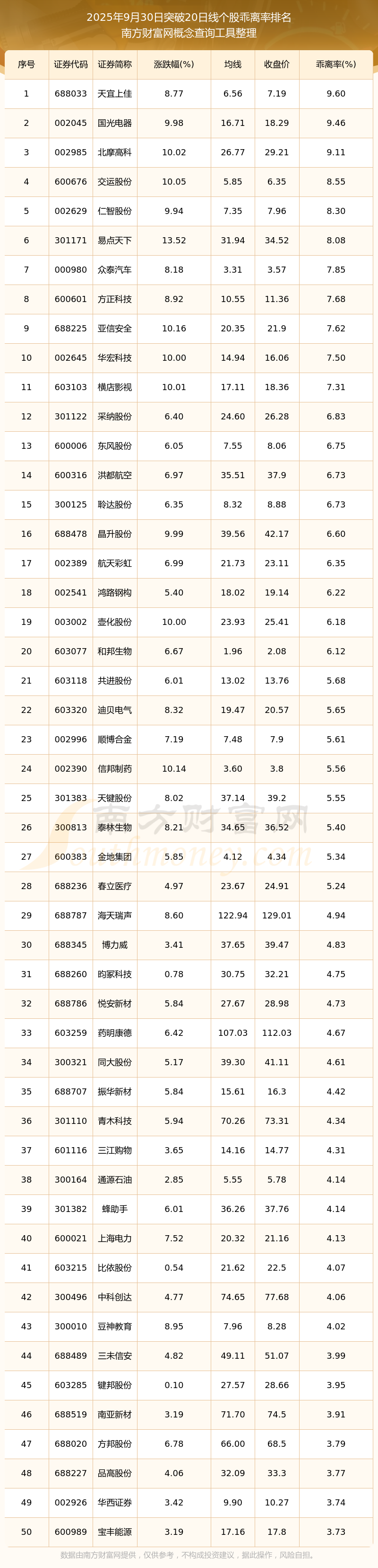2025年9月30日突破20日線個(gè)股乖離率排名