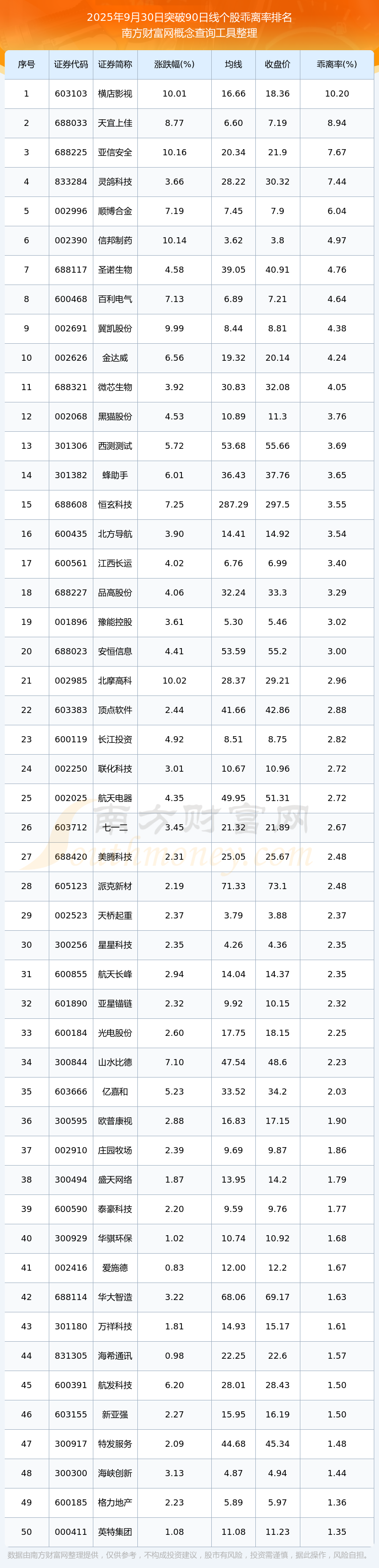 根據(jù)南方財富網(wǎng)概念查詢工具數(shù)據(jù)統(tǒng)計,截止2025年9月30日收盤,共有168只個股收盤價向上突破了90日線,其中乖離率較大的個股有橫店影視、天宜上佳、亞信安全、靈鴿科技、順博合金等,乖離率分別為10.20%、8.94%、7.67%、7.44%、6.04%。