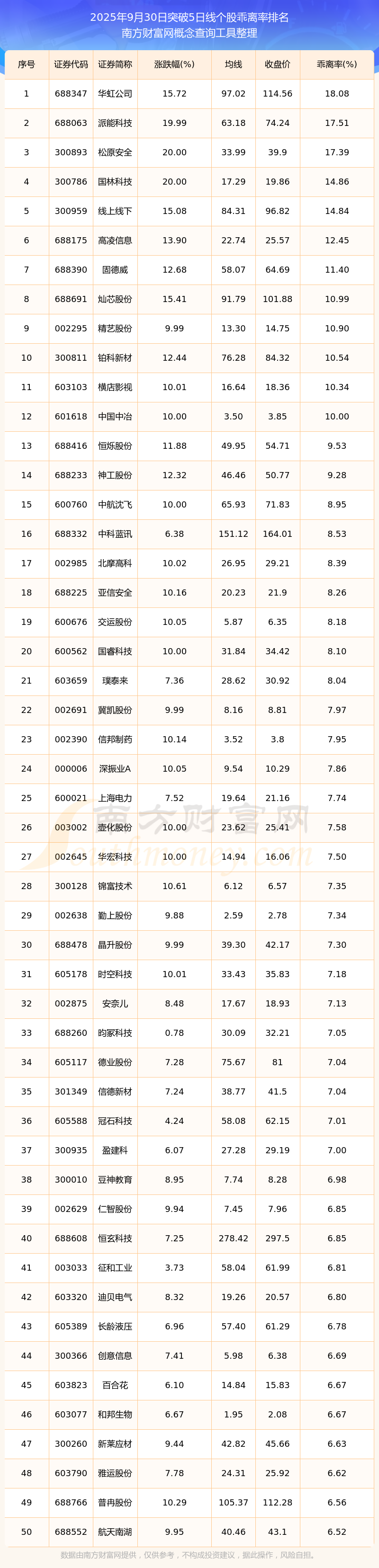 2025年9月30日突破5日線個(gè)股乖離率排名