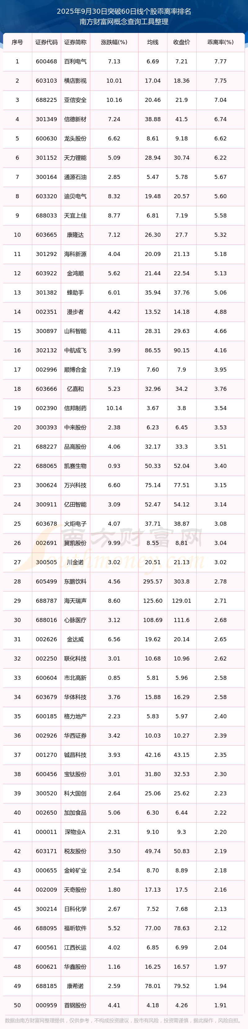 根據(jù)南方財(cái)富網(wǎng)概念查詢工具數(shù)據(jù)統(tǒng)計(jì),截止2025年9月30日收盤,共有160只個(gè)股收盤價(jià)向上突破了60日線,其中乖離率較大的個(gè)股有百利電氣、橫店影視、亞信安全、信德新材、龍頭股份等,乖離率分別為7.77%、7.75%、7.04%、6.74%、6.62%。 2025年9月30日突破60日